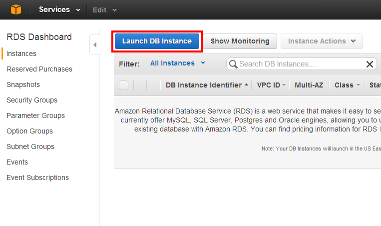 위쪽의 Launch DB Instance 버튼을 클릭하여 RDS DB 인스턴스를 생성합니다.