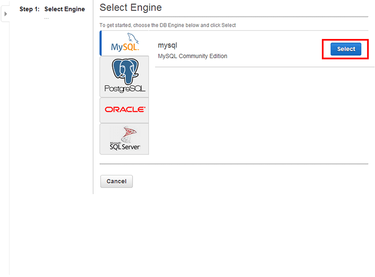 RDS DB 인스턴스에 사용할 데이터베이스 엔진을 선택합니다. MySQL Community Edition의 Select 버튼을 클릭합니다.