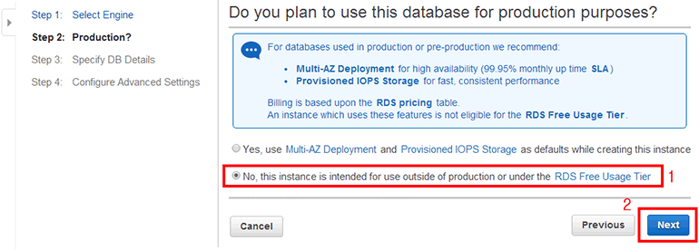 그림 13-7 RDS 프리 티어 선택