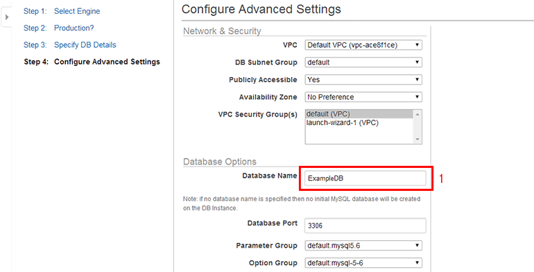 - Database Name: 생성할 DB 이름입니다. ExampleDB로 설정합니다. 아무것도 입력하지 않으면 DB 인스턴스에서 MySQL 서버만 실행되고 DB는 생성되지 않습니다.