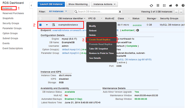 RDS DB 인스턴스(exampledbinstance)의 Read Replica를 생성해보겠습니다. RDS DB 인스턴스 목록(Instances)에서 DB 인스턴스(exampledbinstance)를 선택하고 마우스 오른쪽 버튼을 클릭하면 팝업 메뉴가 나옵니다. Create Read Replica를 클릭합니다.