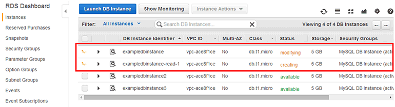 마스터 DB 인스턴스(exampledbinstance)도 설정을 해야 하기 때문에 Status가 modifying으로 표시됩니다(설정은 약 5분 정도 소요됩니다).
