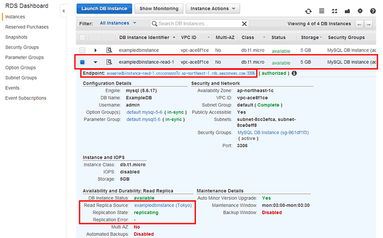 Read Replica 인스턴스(exampledbinstance-read-1)가 완전히 생성된 후 세부 내용에 엔드포인트 주소, Read Replica Source, Replication State가 표시됩니다. 제가 생성한 Read Replica 인스턴스의 엔드포인트 주소는 exampledbinstance-read-1.cnlconsezo7y.ap-northeast-1.rds.amazonaws.com:3306입니다.
