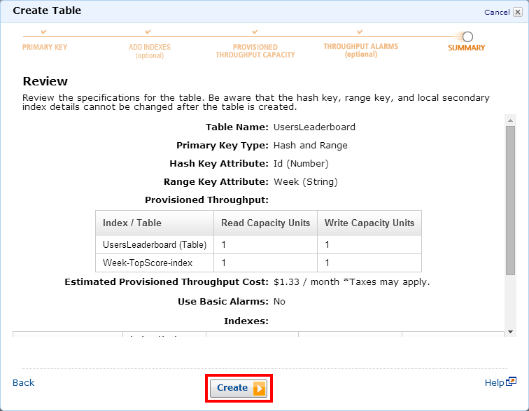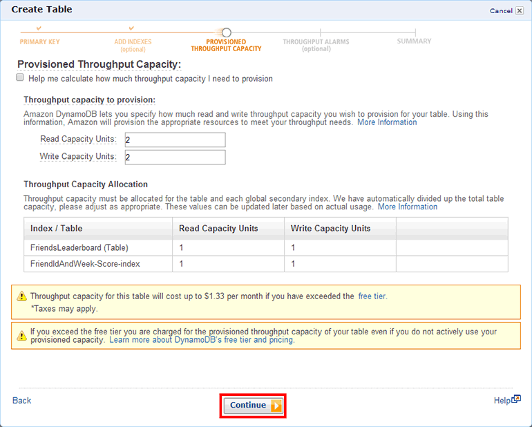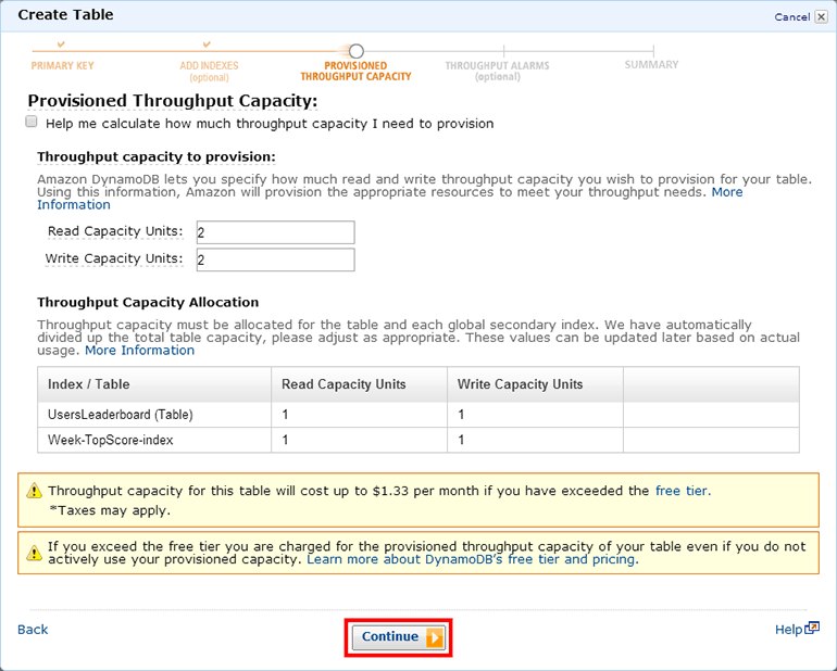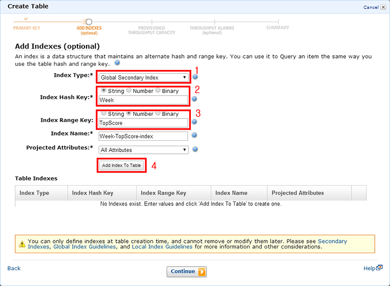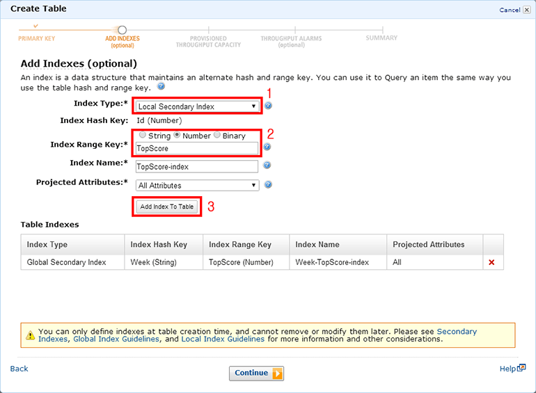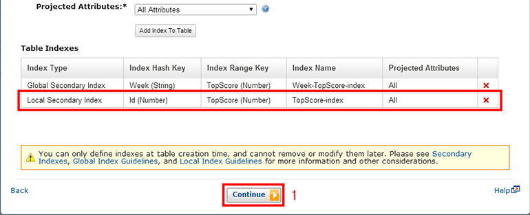 Table Indexes에 글로벌 보조 인덱스가 추가되었습니다. 그리고 Continue 버튼을 클릭합니다.