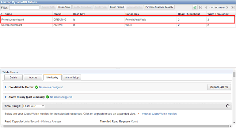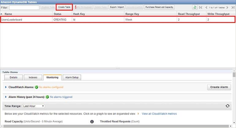 이제 주간 친구 순위 산출을 위해 FriendsLeaderboard 테이블을 생성합니다. 위쪽 Create Table 버튼을 클릭합니다.