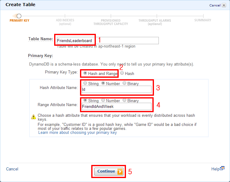 - Range Attribute Name: 범위 기본 키의 속성 이름과 데이터 형식입니다. String을 선택하고 FriendIdAndWeek를 입력합니다.