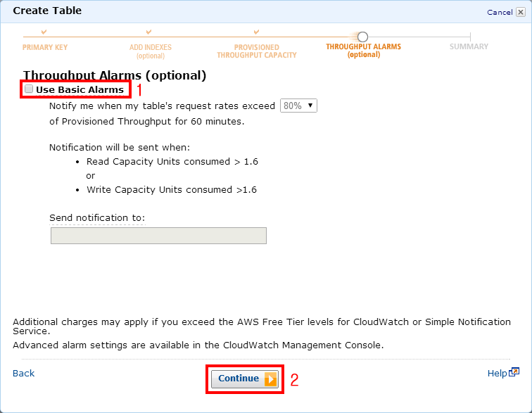 상세한 조건의 알람은 CloudWatch에서 설정할 수 있습니다. 설정이 완료되었으면 Continue 버튼을 클릭합니다.