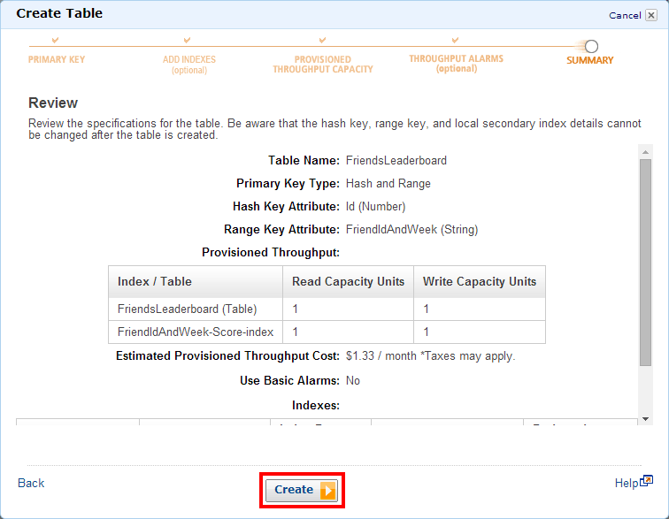 - Throughput Capacity Allocation: 생성된 보조 인덱스에도 읽기/쓰기 용량 유닛을 설정할 수 있습니다(각 숫자를 클릭하면 값을 수정할 수 있습니다). 기본값 그대로 사용합니다.