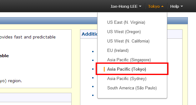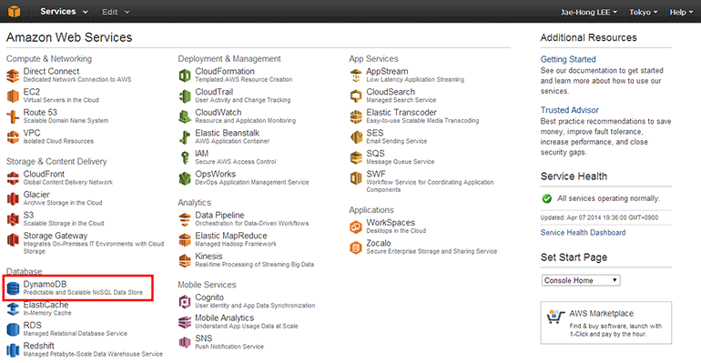오른쪽 위에서 DynamoDB의 리전을 변경할 수 있습니다. 이 책에서는 우리나라에서 가장 가까운 Tokyo 리전을 사용하겠습니다.