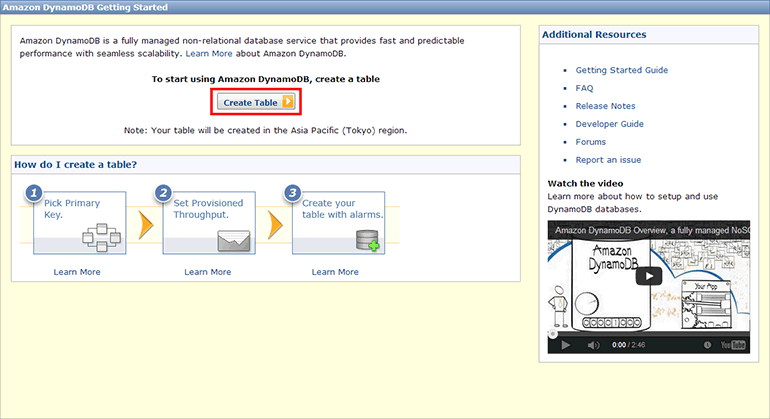 DynamoDB 메인 페이지에서 Create Table 버튼을 클릭합니다.