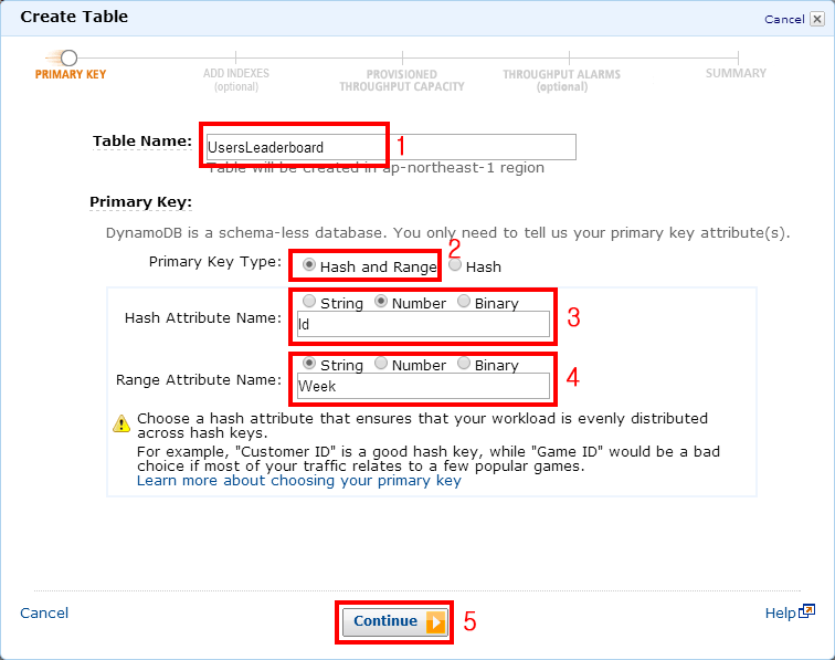 - Primary Key Type: 해시 기본 키와 범위 기본 키 또는 해시 기본 키만 사용하는 옵션입니다. Hash and Range를 선택합니다.