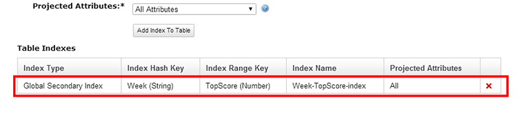 - Index Range Key: 인덱스 범위 키의 속성 이름입니다. Number를 선택하고 TopScore를 입력합니다.