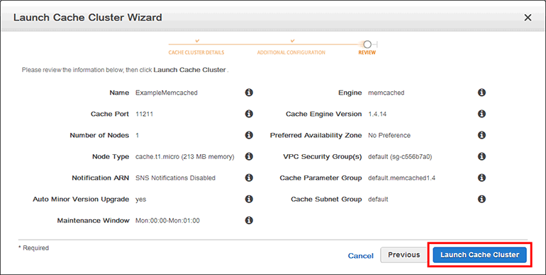 지금까지 설정한 내용에 이상이 없는지 확인합니다. 이상이 없으면 Launch Cache Cluster 버튼을 클릭합니다.