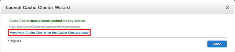 캐시 클러스터 생성이 시작되었습니다. View your Cache Cluster on the Cache Clusters page 링크를 클릭합니다.