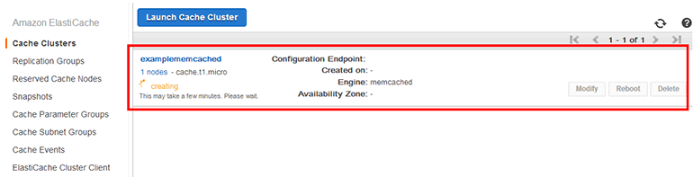 ElastiCache 캐시 클러스터 목록(Amazon ElastiCache → Cache Clusters)에서 방금 설정한 Memcached 클러스터가 생성되고 있습니다. 완전히 생성되기까지 약 5분 정도 소요됩니다.
