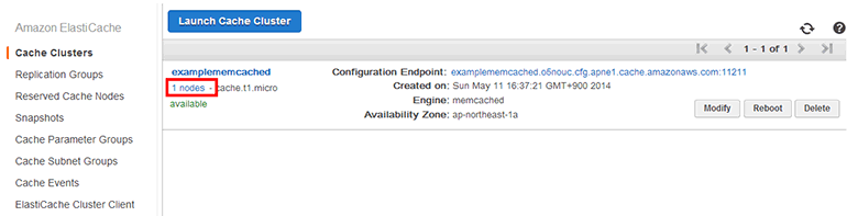 Memcached 클러스터 생성이 완료되었으면 1 nodes 링크를 클릭합니다.