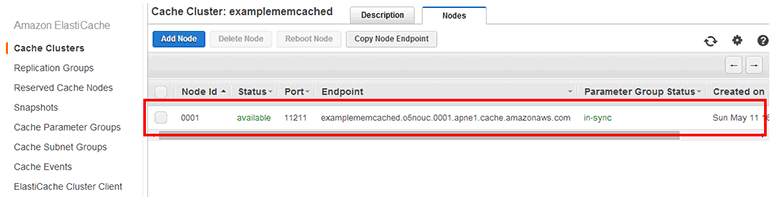 그림 15-14 ElastiCache Memcached 캐시 노드 목록