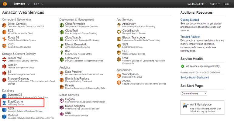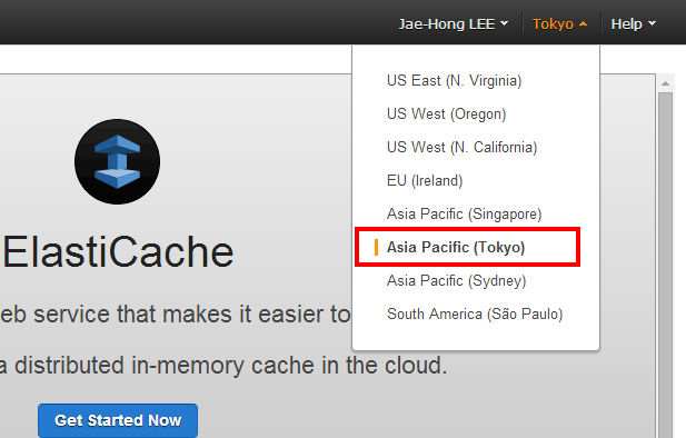 오른쪽 위에서 ElastiCache의 리전을 변경할 수 있습니다. 이 책에서는 우리나라에서 가장 가까운 Tokyo 리전을 사용하겠습니다.