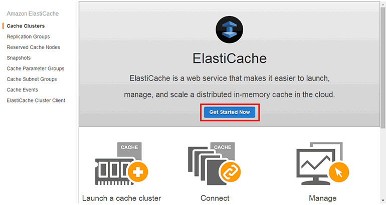 ElastiCache에서 클러스터를 생성하지 않았다면 그림 15-7과 같은 페이지가 표시됩니다. Get Started Now를 클릭합니다.