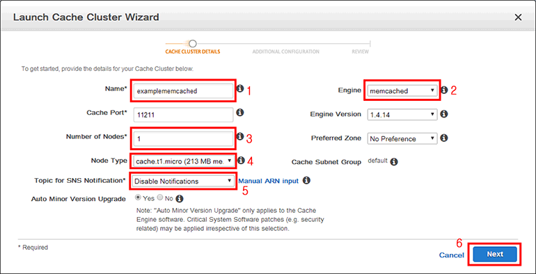 - Name: 클러스터 이름입니다. examplememcached를 입력합니다.