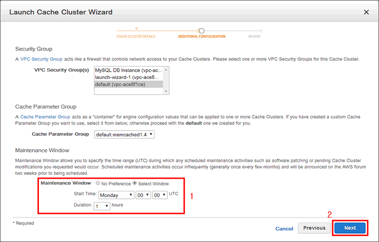 - VPC Security Group: 방화벽 설정인 Security Group입니다. 기본값 그대로 사용합니다. 이 Security Group은 나중에 Memcached 클러스터 전용으로 따로 생성해야 합니다.