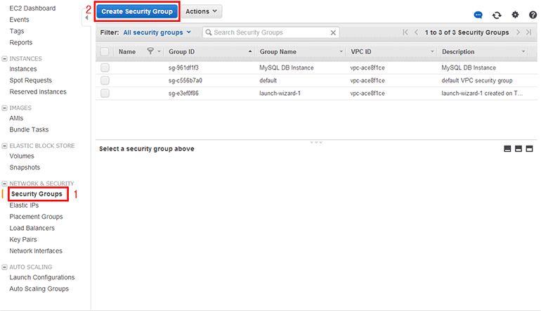NETWORK & SECURITY → Security Groups를 클릭한 뒤 위쪽의 Create Security Group 버튼을 클릭합니다.