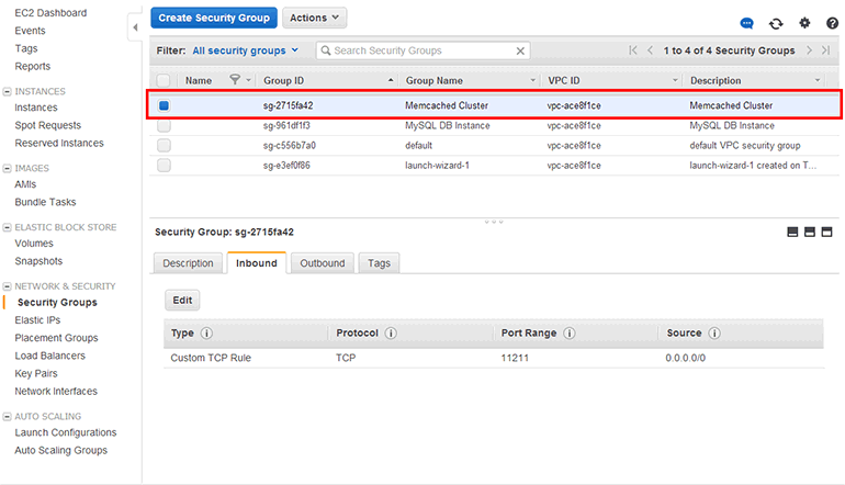 Security Group 목록(NETWORK & SECURITY → Security Groups)에 Memcached Cluster Security Group이 생성되었습니다.
