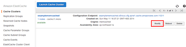 ElastiCache 캐시 클러스터 목록에서 Memcached 클러스터(examplememcached)에 있는 Modify 버튼을 클릭합니다.