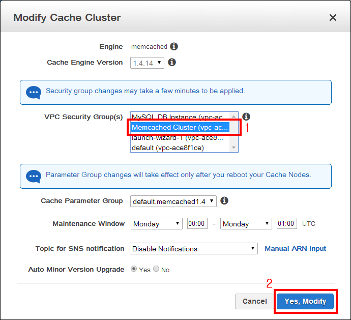 ElastiCache Memcached 클러스터의 설정을 변경합니다. VPC Security Group(s)에서 방금 생성한 Memcached Cluster를 선택하고 아래쪽 Yes, Modify를 클릭합니다.