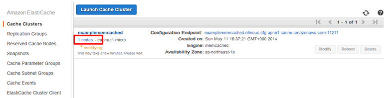 Memcached 클러스터(examplememcached)의 설정이 변경 중입니다. 약 10초 정도 기다리면 설정이 완전히 적용됩니다. 1 nodes 링크를 클릭하여 캐시 노드 목록으로 이동합니다.