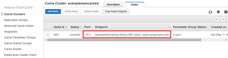 Memcached 클러스터의 캐시 노드 목록에서 포트 번호와 엔드포인트 주소를 확인할 수 있습니다.