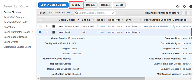 ElastiCache 캐시 클러스터 목록에서 Memcached 클러스터(examplememcached)에 있는 Modify 버튼을 클릭합니다.