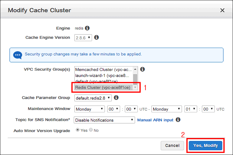 ElastiCache Redis 클러스터의 설정을 변경합니다. VPC Security Group(s)에서 방금 생성한 Redis Cluster를 선택하고 아래쪽 Yes, Modify를 클릭합니다.