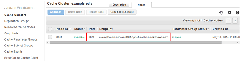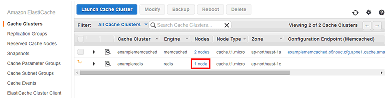 이제 다시 ElastiCache 캐시 클러스터 목록(Amazon ElastiCache → Cache Clusters)으로 이동합니다.