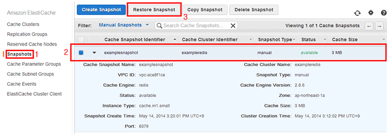 ElastiCache 스냅샷 목록(Amazon ElastiCache → Snapshots)에서 Redis 스냅샷(examplesnapshot)을 선택하고 위쪽 Restore Snapshot 버튼을 클릭합니다.