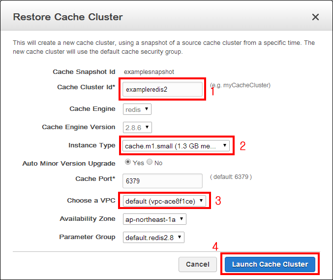 - Cache Cluster Id: Redis 스냅샷을 이용하여 새로 생성될 Redis 클러스터의 이름입니다. exampleredis2를 입력합니다.