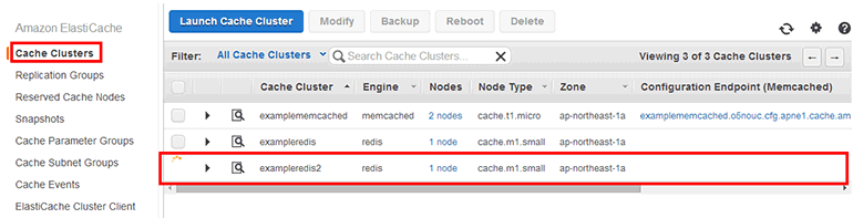 ElastiCache 캐시 클러스터 목록(Amazon ElastiCache → Cache Clusters)으로 이동합니다. 캐시 클러스터 목록에 Redis 스냅샷으로 Redis 클러스터(exampleredis2)가 생성되고 있습니다. 완전히 생성되기까지 약 10분 정도 소요됩니다.