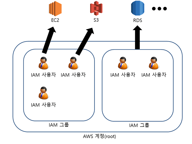 IAM은 AWS 계정 안에 IAM 그룹과 사용자를 생성하여 접근제어 및 권한관리를 세분화할 수 있습니다. 어떤 IAM 사용자는 EC2만 관리할 수 있고, 어떤 IAM 사용자는 S3의 내용을 읽을 수만 있도록 구성할 수 있습니다. 따라서 전체 권한이 아닌 필요한 권한만 주기 때문에 보안성이 높아집니다. IAM 그룹은 동일한 권한을 여러 IAM 사용자에게 적용시킬 때 사용합니다.