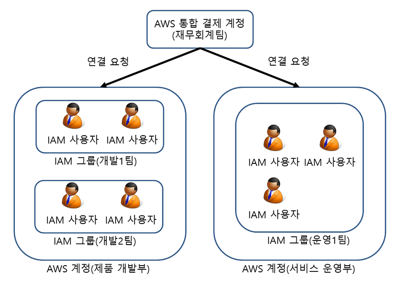 부서가 다를 때는 AWS 계정을 분리하여 구성하면 매우 편리합니다. 제품 개발부의 개발용 EC2 인스턴스에 서비스 운영부의 사람들이 마음대로 접근해서는 안되겠죠. 이처럼 실제 조직의 특성에 맞게 접근제어와 권한관리를 설정할 수 있습니다.