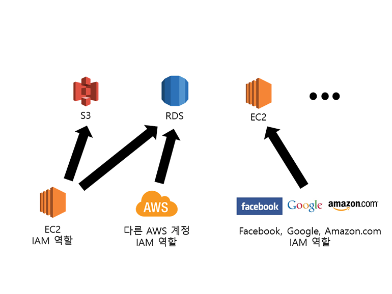 IAM 그룹과 사용자에게 권한을 설정하는 것과는 달리 EC2 인스턴스 전용으로 권한을 설정할 수 있습니다. 이것을 IAM 역할Role이라고 합니다. IAM 역할은 EC2 인스턴스뿐만 아니라 다른 AWS 계정(또는 다른 AWS 계정의 IAM 사용자), Facebook, Google, Amazon.com 계정 전용으로 권한을 설정할 수 있습니다.