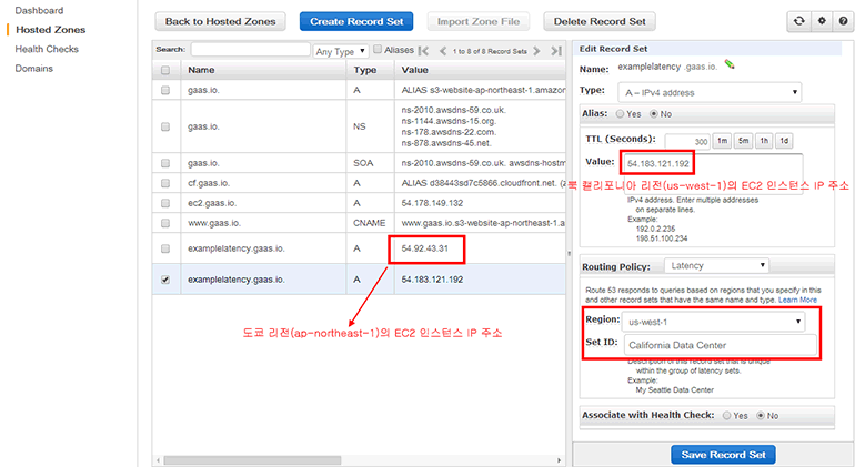 - Set ID: 같은 도메인의 Latency Based Routing A 레코드끼리 구분할 수 있도록 ID를 설정합니다(예: Tokyo Data Center, California Data Center).