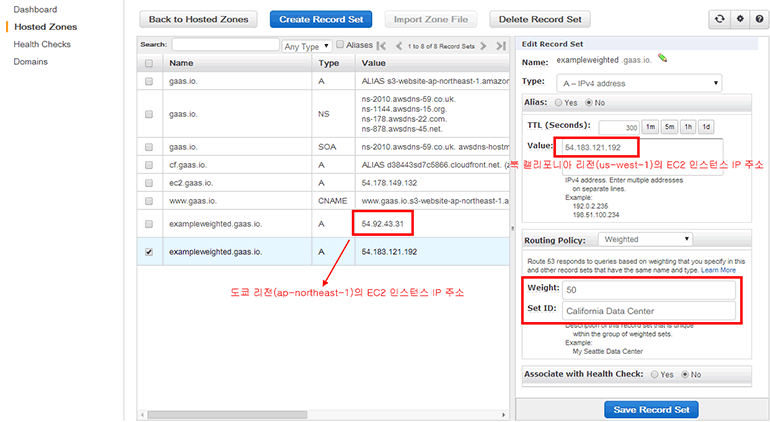 동일한 도메인(서브, 루트 도메인)으로 가중치Weight 값을 다르게 설정하여 Weighted Round Robin A 레코드를 계속 생성합니다.