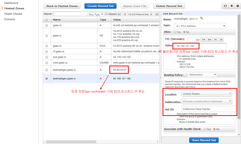 - Set ID: 같은 도메인의 Geo Routing A 레코드끼리 구분할 수 있도록 ID를 설정합니다(예: Tokyo Data Center, California Data Center).