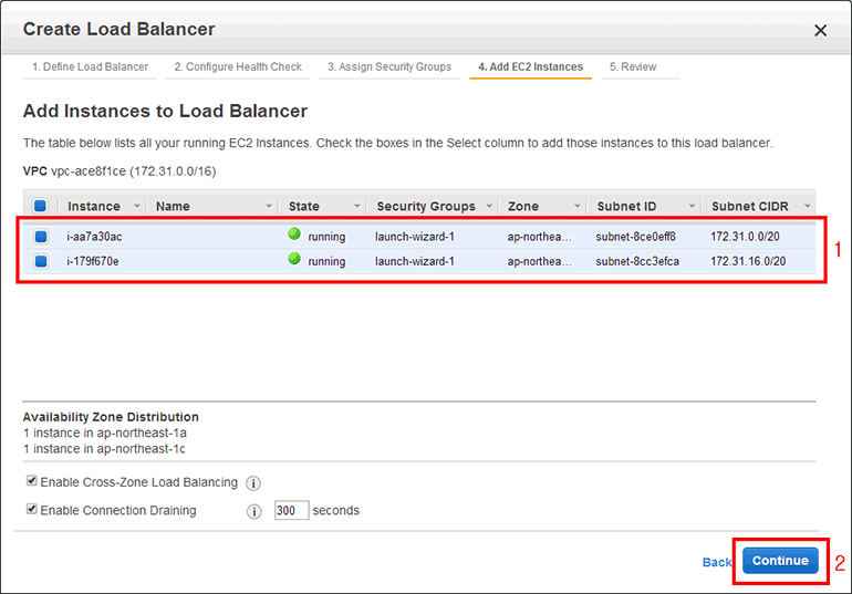 앞에서 생성한 EC2 인스턴스 2개를 선택하여 ELB 로드 밸런서에 연결합니다(그림 18-10).