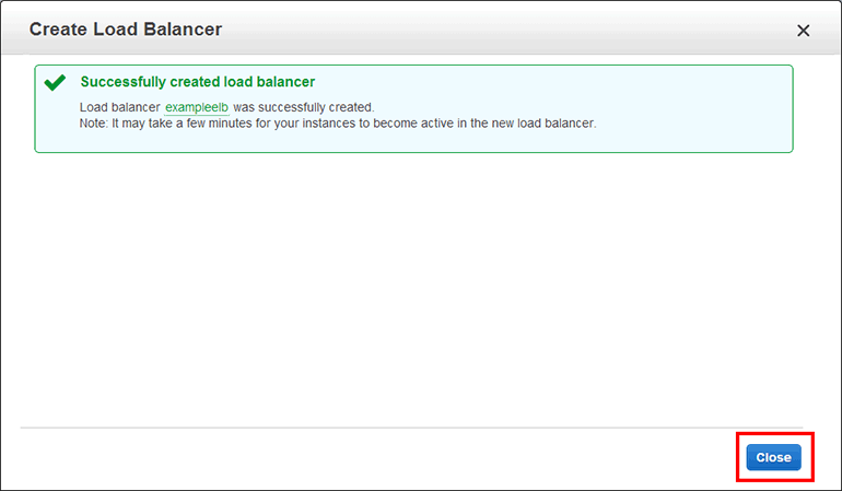 ELB 로드 밸런서(exampleelb) 생성이 완료되었습니다. Close 버튼을 클릭합니다.