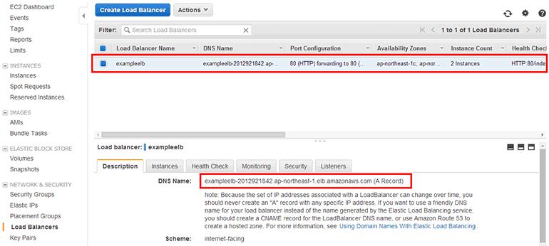 ELB 로드 밸런서 목록(NETWORK & SECURITY → Load Balancers)에 ELB 로드 밸런서(exampleelb)가 생성되었습니다. 아래 ELB 세부 내용에 이 ELB 로드 밸런서의 DNS Name이 표시됩니다. 앞으로 서비스에 접속할 때는 EC2 인스턴스에 바로 접속하지 않고 ELB 로드 밸런서의 URL로 접속합니다.