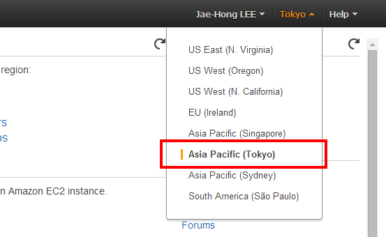 오른쪽 위에서 ELB와 EC2가 생성되는 리전을 변경할 수 있습니다. 이 책에서는 우리나라에서 가장 가까운 Tokyo 리전을 사용하겠습니다.