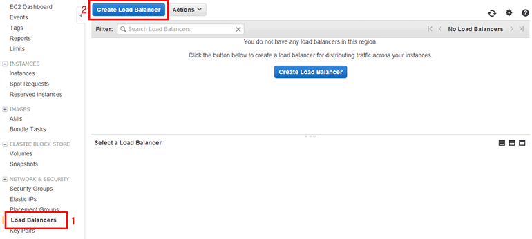 EC2 페이지에서 ELB 로드 밸런서 목록(NETWORK & SECURITY → Load Balancers)을 클릭하고, 위쪽 Create Load Balancer 버튼을 클릭합니다.