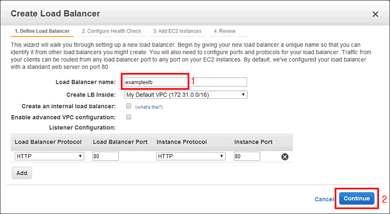 - Load Balancer name: 로드 밸런서 이름입니다. exampleelb를 입력합니다.