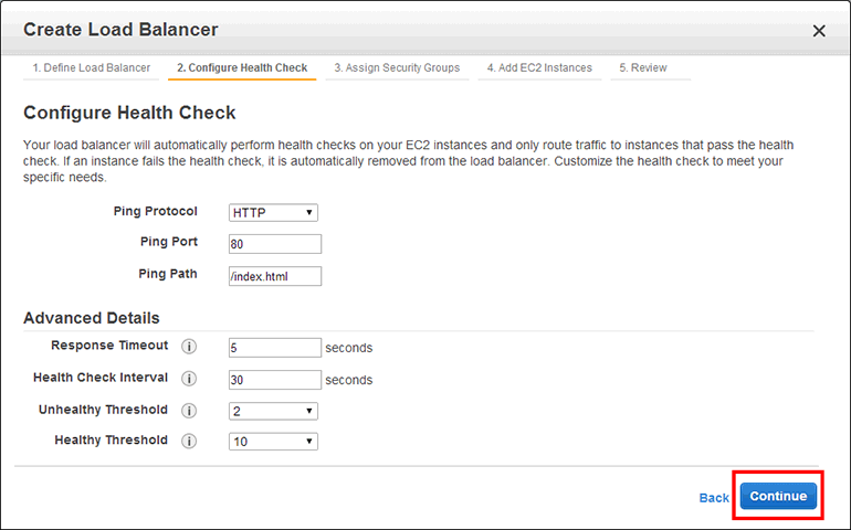 - Response Timeout: 헬스 체크 응답 시간입니다. 이 시간이 지나도 응답이 없으면 EC2 인스턴스 가동 확인에 실패한 것으로 판단합니다. 기본값 그대로 사용합니다.